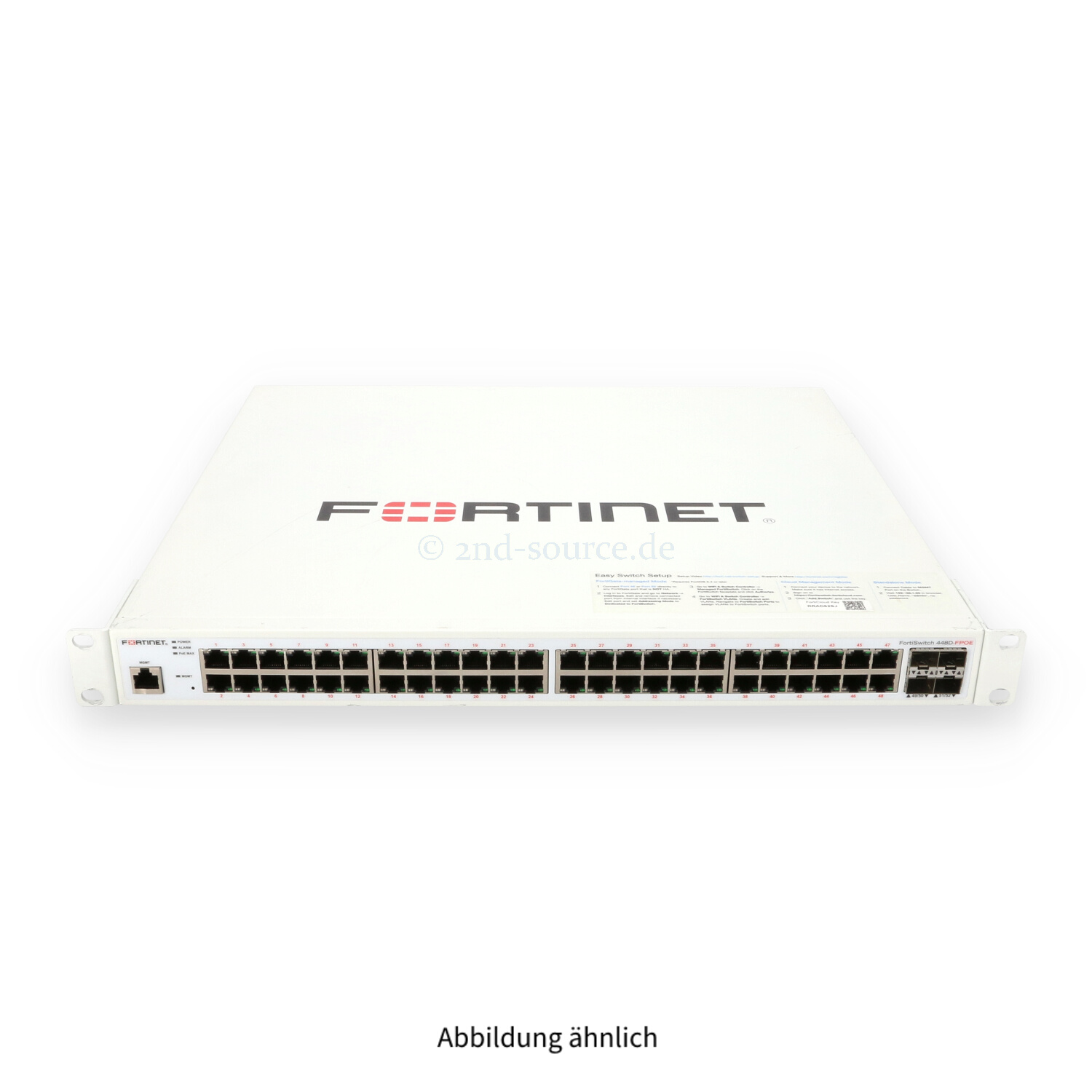 | Modell | Fortinet FortiSwitch 448D-FPOE 48x RJ-45 1GbE PoE+ 4x SFP+ 10GbE 2x 950W Switch |