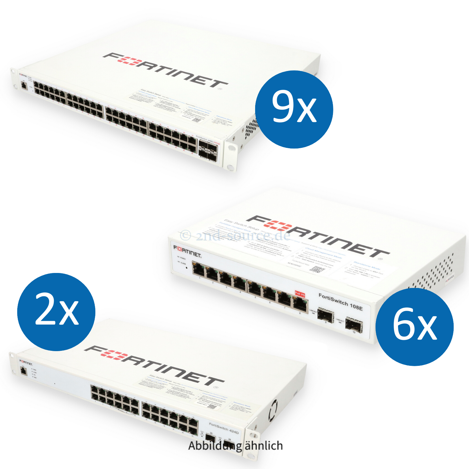 | Modell | Fortinet Bundle aus 9x FortiSwitch 448D-FPOE, 6x 108E, 2x 424D und 6x 1GbE Transceiver Module |